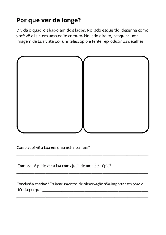 Neste material, você encontrará uma atividade de associação entre instrumentos de observação (telescópio, satélite, binóculo, luneta) e suas respectivas funções. Há também um desafio de desenho comparativo da Lua vista a olho nu e através de um telescópio, culminando em uma conclusão escrita sobre a importância desses instrumentos para a ciência.