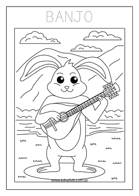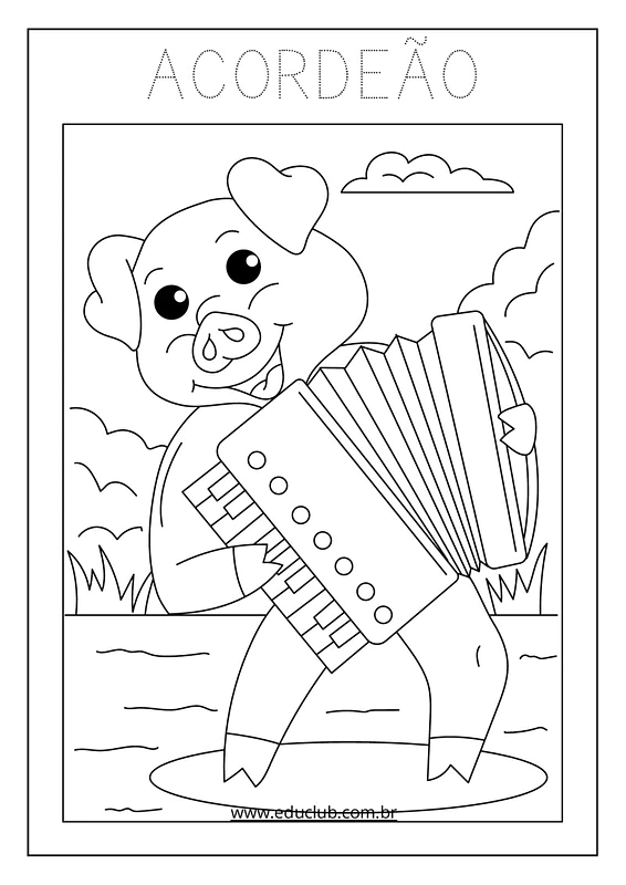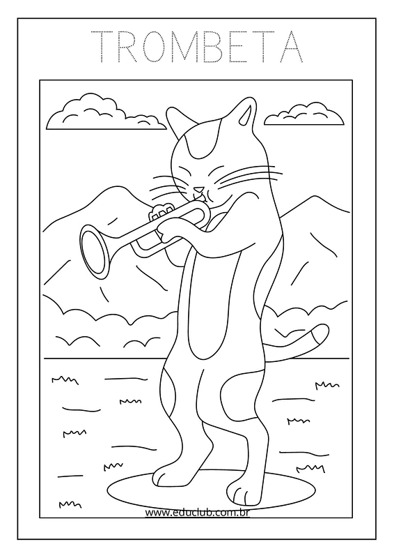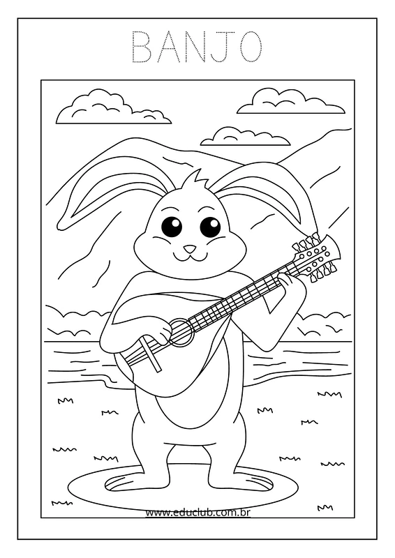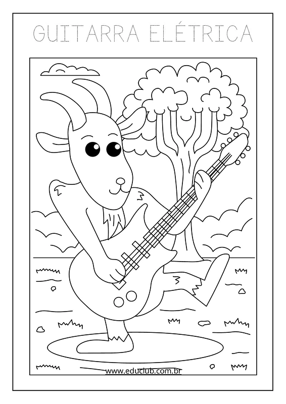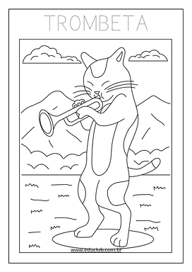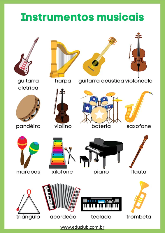 Neste material, você encontrará uma série de atividades visuais com ilustrações claras de instrumentos como guitarra, harpa, violoncelo, pandeiro, violino, bateria, saxofone, maracas, xilofone, piano, flauta, triângulo, acordeão, teclado e trombeta. Cada página apresenta um instrumento diferente, ideal para a exploração individual ou em grupo.