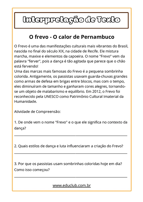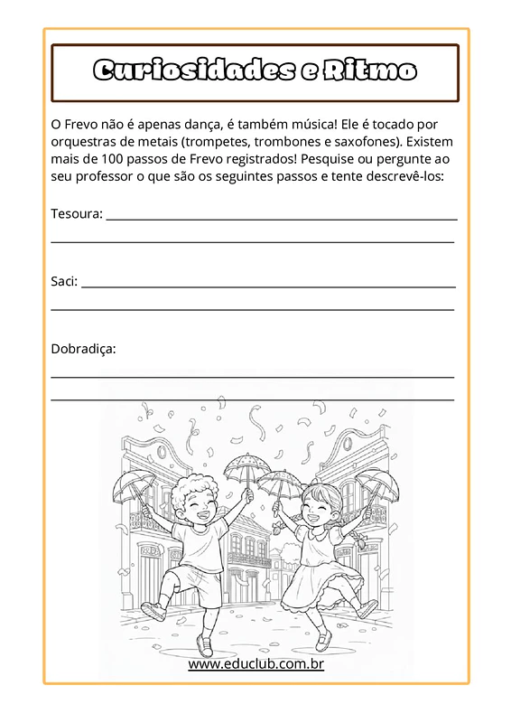 Neste material, você encontrará um texto informativo sobre o frevo, abordando sua origem, características e o significado da sombrinha. Há também questões de interpretação textual, uma atividade de desenho e colorir a sombrinha do frevo, uma seção de pesquisa sobre passos de dança e uma proposta de produção textual criativa, onde os alunos se imaginam como passistas.