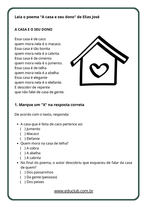 - Interpretação (Múltipla Escolha): Questões sobre o dono de cada casa (caco, telha) e a conclusão do poema sobre a "casa de gente".