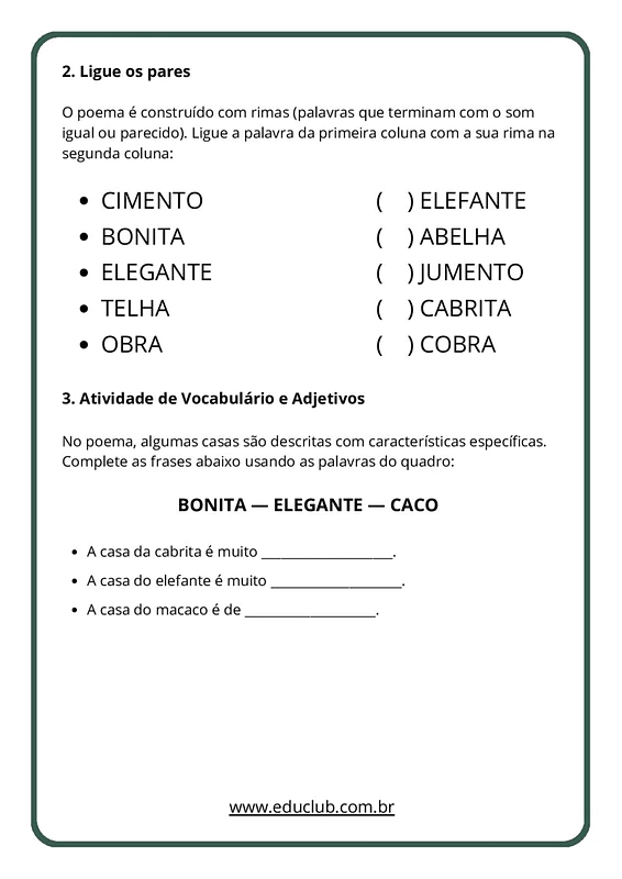 - Oficina de Rimas: No exercício de "Ligue os pares", peça que os alunos digam outras palavras que rimem com "telha" ou "bonita", expandindo a atividade para além do papel.