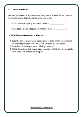 - Desafio do Novo Poeta: Incentive os alunos a compartilharem os novos versos criados na seção "O novo morador", promovendo um momento de declamação na sala.