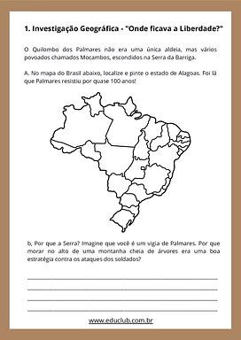 A primeira seção, "Investigação Geográfica — Onde ficava a Liberdade?", apresenta o contexto territorial do quilombo, explicando que Palmares não era uma única aldeia, mas um conjunto de vários povoados chamados Mocambos, localizados na Serra da Barriga. O aluno é convidado a localizar e pintar o estado de Alagoas em um mapa do Brasil e a refletir, colocando-se no lugar de um vigia do quilombo, sobre as razões estratégicas de se estabelecer no alto de uma montanha coberta de mata.