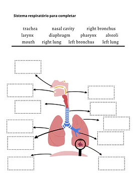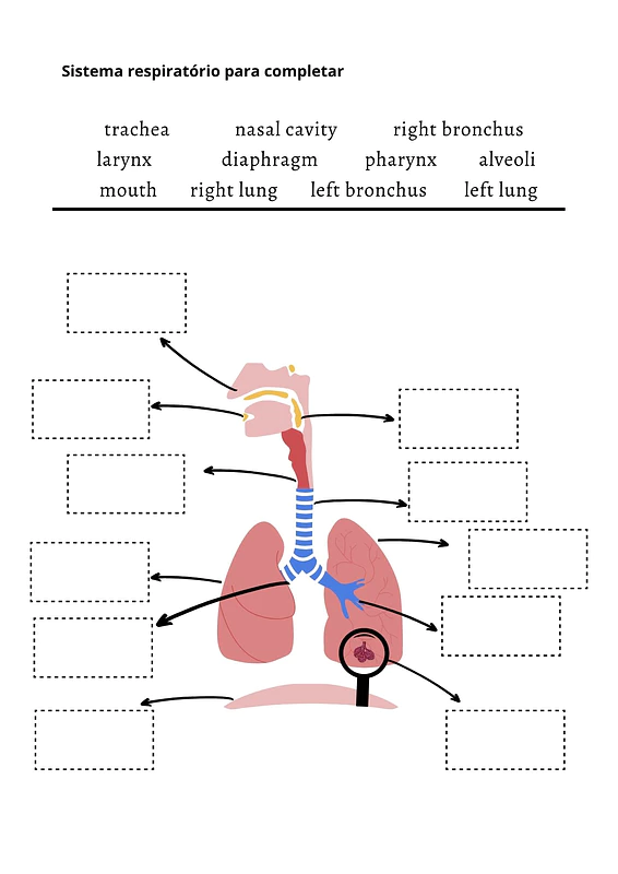 Nesta primeira atividade, os alunos têm um diagrama do sistema respiratório com espaços em branco e um banco de palavras contendo os nomes das suas partes (traqueia, laringe, pulmão, etc.). A tarefa é escrever o nome de cada órgão no local correspondente. Este exercício é ideal para uma primeira introdução, pois permite a consulta e a associação entre o nome e a imagem.