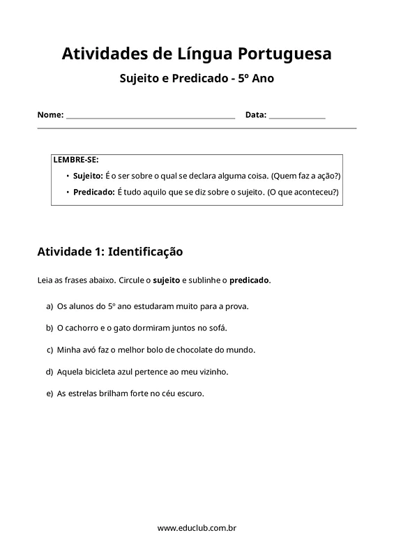 As atividades sobre sujeito e predicado para 5º ano são um recurso didático fundamental para consolidar o conhecimento dos alunos sobre a estrutura básica da oração. Este material foi cuidadosamente elaborado para facilitar a compreensão e a aplicação dos conceitos de sujeito e predicado, essenciais para o desenvolvimento da competência linguística.