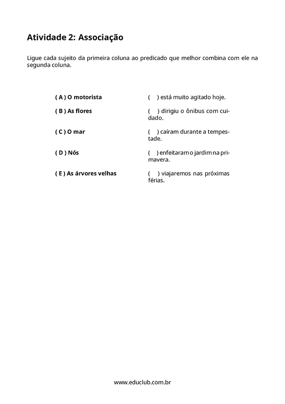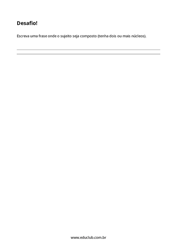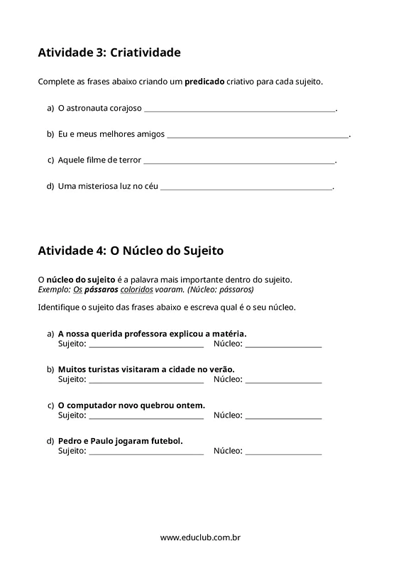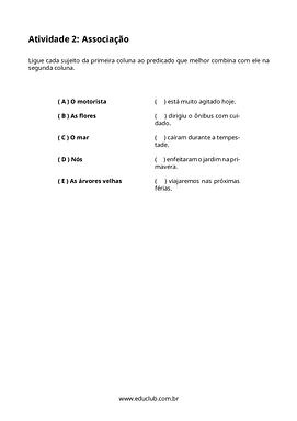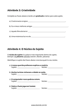 Neste material, você encontrará quatro atividades distintas: identificação de sujeito e predicado, associação entre sujeitos e predicados, criação de predicados criativos e identificação do núcleo do sujeito. Há também um desafio extra para a produção de frases com sujeito composto, proporcionando uma experiência de aprendizado completa e engajadora.