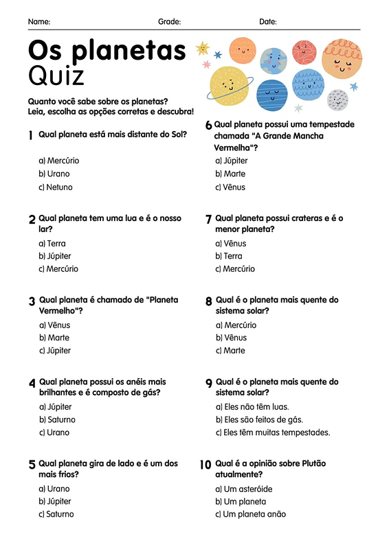 A avaliação de ciencias 5 ano sistema solar com gabarito é um recurso didático envolvente, ideal para verificar o conhecimento dos alunos sobre os planetas e suas características. Este quiz interativo oferece uma maneira divertida e eficaz de consolidar o aprendizado sobre o nosso sistema planetário.