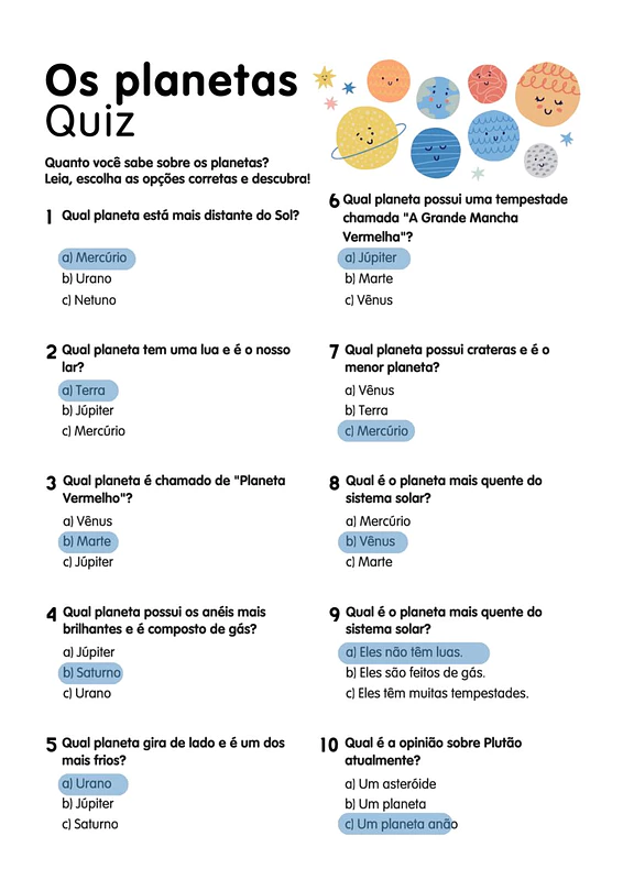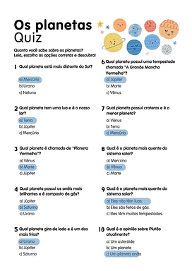 Neste teste, você encontrará um quiz com 10 questões de múltipla escolha sobre os planetas do Sistema Solar, abordando temas como características físicas, nomes populares e curiosidades. O material inclui um gabarito para facilitar a correção e o acompanhamento do desempenho dos estudantes.