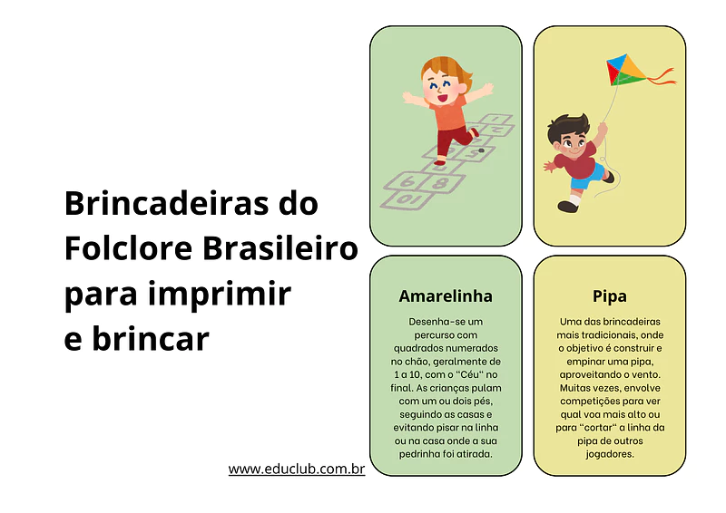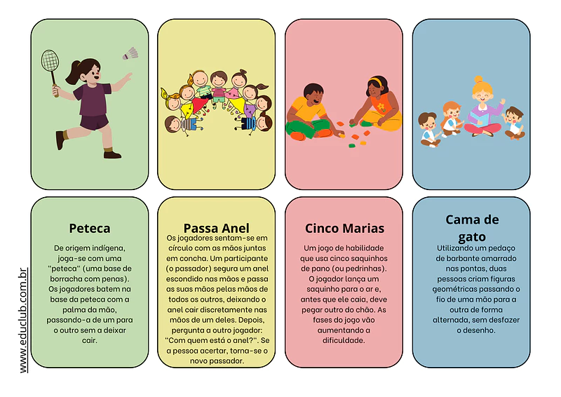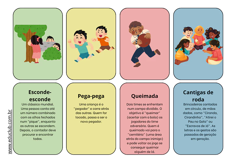 Nosso arquivo em PDF gratuito é uma coleção de flashcards, cada um dedicado a uma brincadeira diferente. O material está pronto para imprimir, recortar e ser usado como um guia ou como parte de outras atividades.