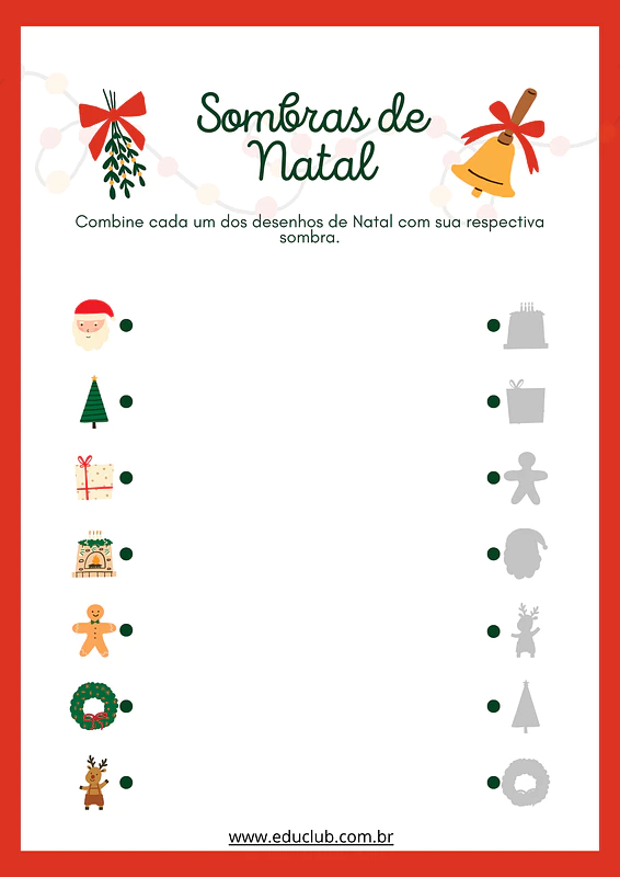- Sombras de Natal: Jogo de correspondência entre imagem e sua sombra.Contando com Símbolos: Atividades para contar e ligar grupos com a mesma quantidade.