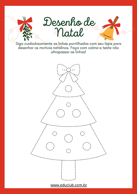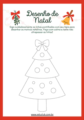 - Desenho pontilhado: Múltiplas páginas para cobrir o traçado de desenhos natalinos e treinar a coordenação.