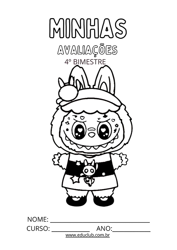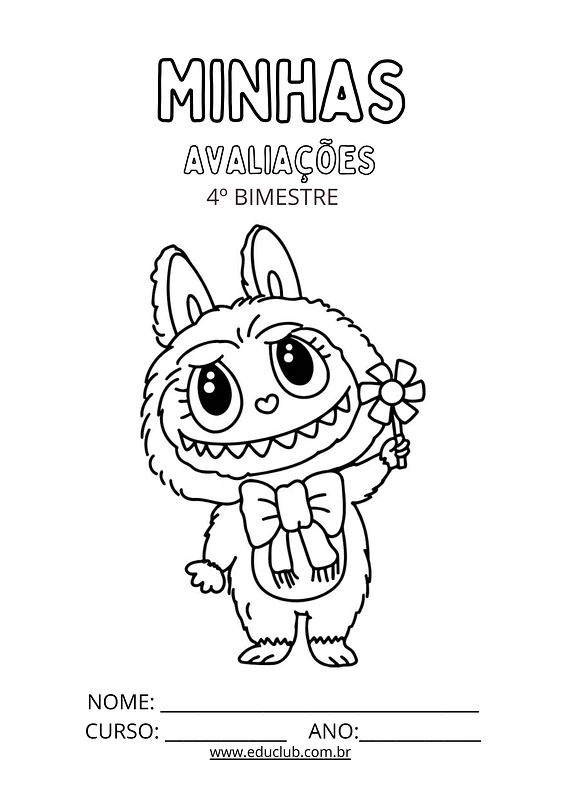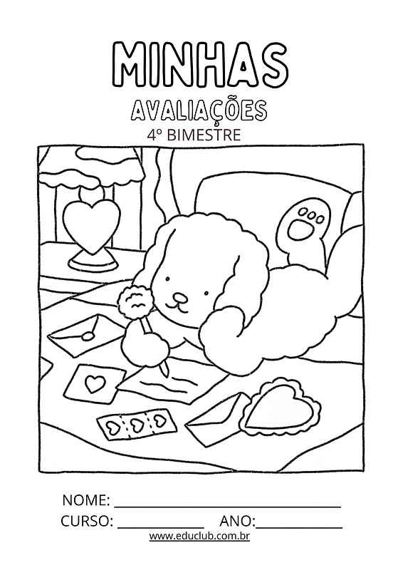 - Modelos de Capas para o 4º Bimestre: Vários designs de capas em uma única folha, todos com o título "Minhas Avaliações - 4º BIMESTRE" e campos para preenchimento de "Nome", "Curso" e "Ano".