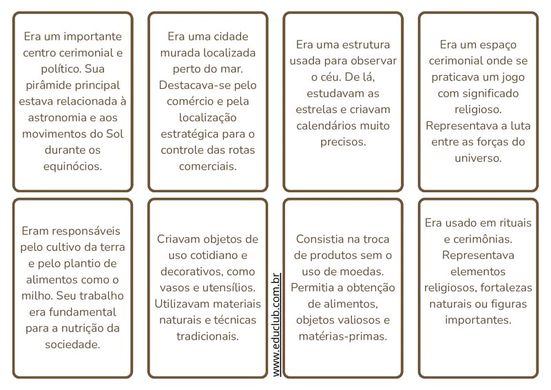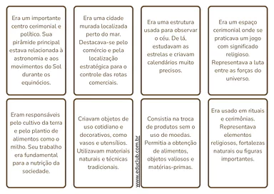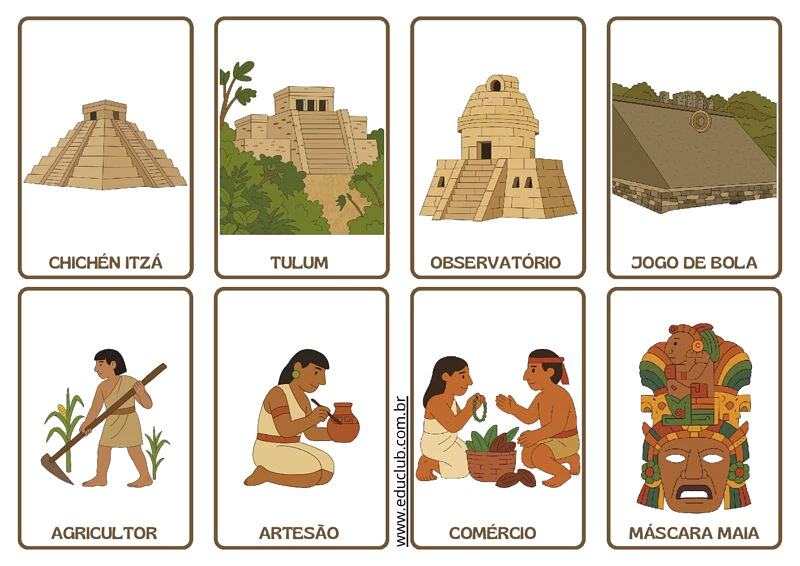 - Criação de um Mapa Mental Gigante: Fixe os cartões em um mural e peça que os alunos desenhem conexões entre eles. Por exemplo, eles podem ligar o Observatório a Chichén Itzá através do tema "Astronomia" , ou ligar o Agricultor ao Comércio através da nutrição da sociedade.