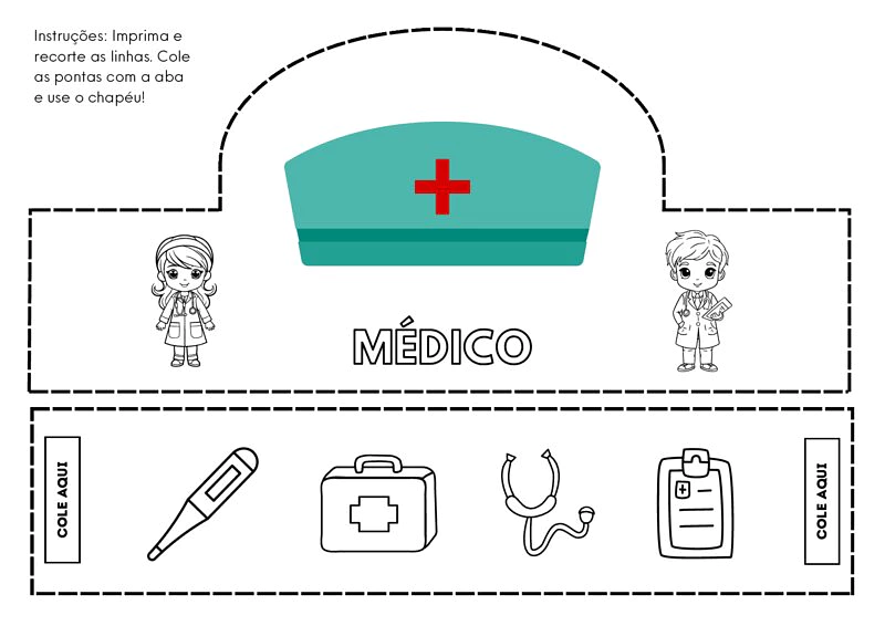 Neste material, você encontrará um molde de chapéu de médico pronto para ser impresso, recortado e colorido. O design é simples e intuitivo, facilitando a montagem pelas crianças com a supervisão de um adulto, e inclui a palavra "MÉDICO" para reconhecimento visual.