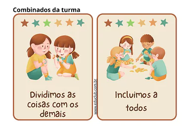 Neste material, você encontrará cartazes prontos para impressão com combinados essenciais para a sala de aula, como 'Escutamos quem precisa', 'Oferecemos nossa ajuda', 'Trabalhamos em equipe', 'Aprendemos juntos', 'Expressamos sentimentos', 'Brincamos juntos', 'Pedimos desculpas', 'Valorizamos a amizade', 'Dividimos as coisas com os demais' e 'Incluímos a todos'. Cada combinado é apresentado de forma clara e ilustrada.