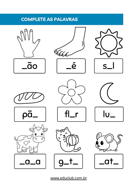 A atividade Complete as palavras com as letras faltantes é um recurso didático envolvente, ideal para auxiliar no processo de alfabetização e no desenvolvimento da consciência fonológica das crianças. Este material foi cuidadosamente elaborado para tornar o aprendizado da escrita e leitura mais dinâmico e divertido.