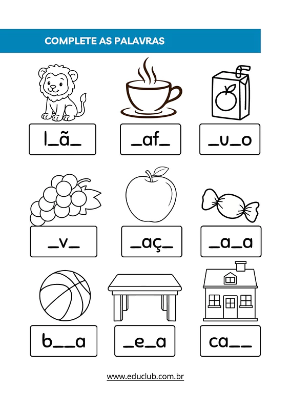 Neste material, você encontrará diversas páginas com palavras incompletas, onde os alunos deverão preencher as lacunas com as letras faltantes para formar as palavras corretas. As palavras são simples e ilustradas, facilitando a associação e o aprendizado.