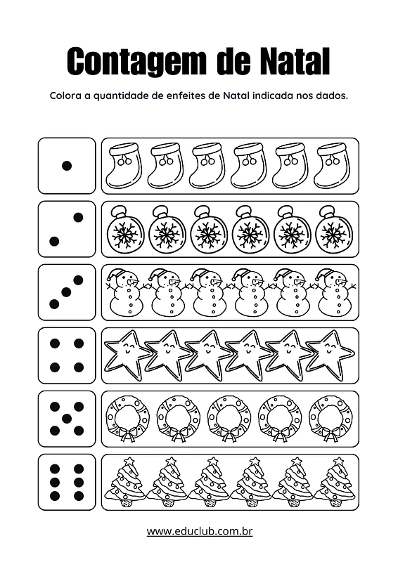 - Elementos visuais: A folha apresenta grupos de enfeites natalinos (bolas de Natal) e, ao lado de cada grupo, a imagem de um dado mostrando uma quantidade. A tarefa da criança é contar os pontos do dado e pintar o número equivalente de enfeites.