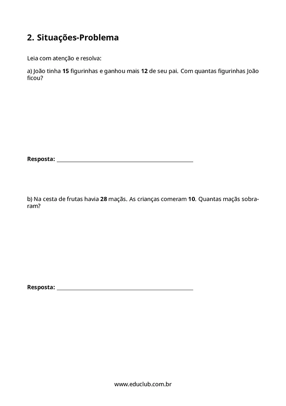 As contas de adição e subtração para 2º ano do Ensino Fundamental podem ser utilizadas como complemento às aulas expositivas, reforço escolar ou como avaliação diagnóstica. Sugere-se a realização das atividades em duplas ou pequenos grupos para fomentar a troca de conhecimentos e a colaboração entre os alunos, ou individualmente para avaliação do progresso.