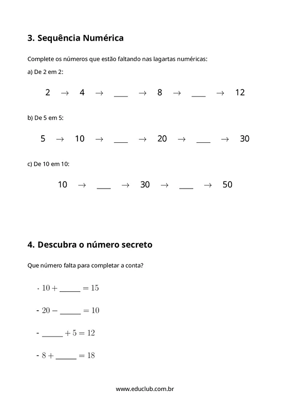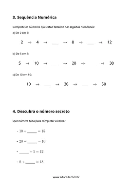 Neste material, você encontrará uma série de atividades diversificadas, incluindo exercícios de cálculo direto, situações-problema que estimulam a aplicação do conhecimento, sequências numéricas para praticar contagem e identificação de padrões, desafios para descobrir números secretos e atividades de ligar resultados, promovendo o cálculo mental.