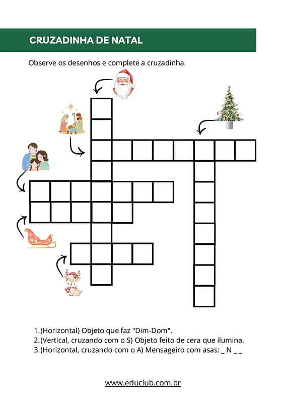 Nesta cruzadinha de Natal, você encontrará uma cruzadinha temática com ilustrações claras e pistas descritivas para cada palavra. As palavras a serem preenchidas são relacionadas a símbolos natalinos, como sino e vela, proporcionando um desafio adequado para as séries iniciais.