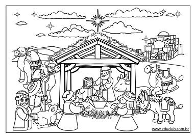 Desenhar e colorir a cena do presépio pode ser utilizado como atividade individual ou coletiva durante o período natalino. Sugere-se iniciar com uma roda de conversa sobre o significado do Natal e os elementos do presépio, depois permitir que cada criança crie sua versão artística. Os trabalhos podem ser expostos na decoração da sala, criando um ambiente festivo e valorizando a produção dos alunos.