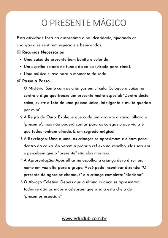 A dinâmica "O Presente Mágico" é uma atividade de apresentação que visa promover a autoestima e a identidade das crianças, ajudando-as a se sentirem especiais e bem-vindas. Utilizando uma caixa de presente colorida e um espelho, a atividade permite que cada criança reconheça sua própria importância e valor. Ao olhar para o espelho e ver seu reflexo, elas descobrem que o verdadeiro presente é elas mesmas. A atividade termina com uma celebração em grupo, onde todos se apresentam e compartilham um momento de união.