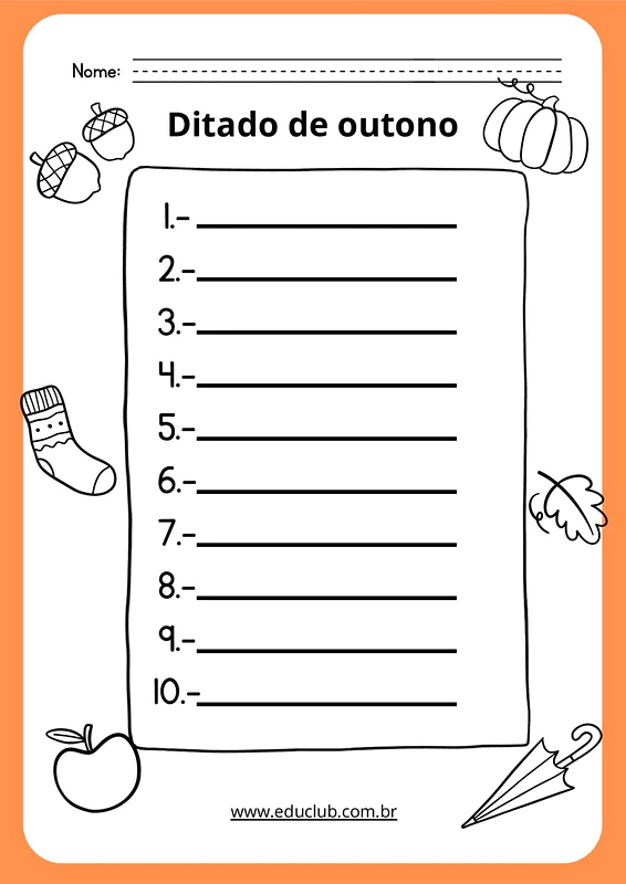 A atividade consiste em uma folha de registro estruturada para a realização de um ditado temático. O material apresenta uma lista numerada de 1 a 10, onde os alunos devem escrever as palavras ou frases ditadas pelo professor. O diferencial desta folha é o seu design focado no outono, o que ajuda a criar uma ambientação lúdica, tornando o exercício de ortografia menos mecânico e mais contextualizado com a época do ano.