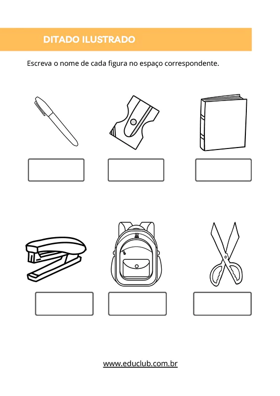 Neste material, você encontrará diversas páginas de ditado ilustrado, cada uma apresentando uma série de figuras. Os alunos deverão escrever o nome de cada figura no espaço correspondente, praticando a escrita e a associação imagem-palavra.