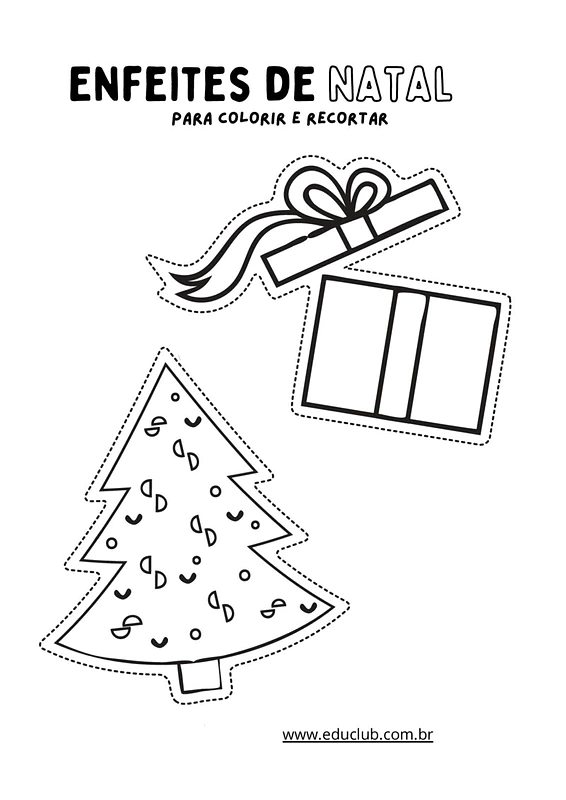 Neste material, você encontrará diversos modelos de enfeites natalinos prontos para serem impressos, coloridos e recortados. São designs variados que incluem elementos clássicos do Natal, proporcionando uma atividade completa de colorir e recortar.