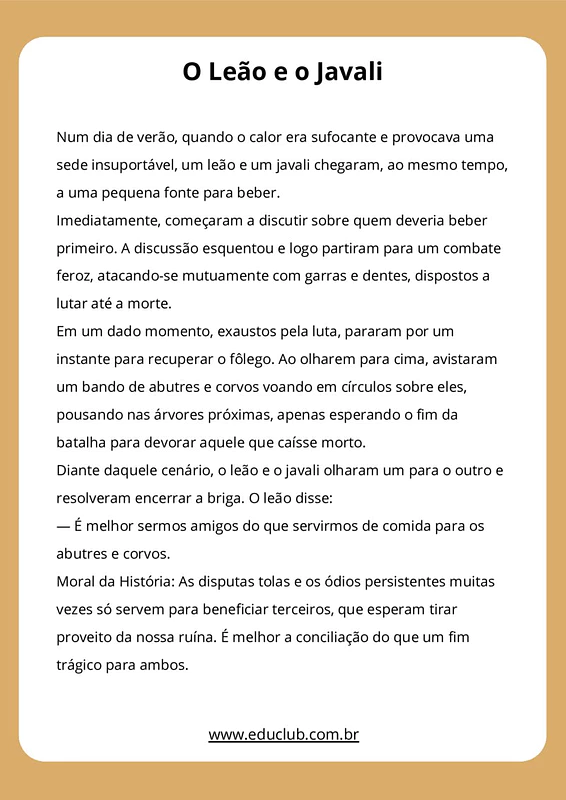 • Atividade: Divida a turma em trios (um leão, um javali e um narrador). Eles devem encenar a briga e, principalmente, o momento em que decidem parar. Incentive-os a criar um diálogo novo sobre como eles poderiam ter dividido a fonte de água desde o início, sem precisar lutar.