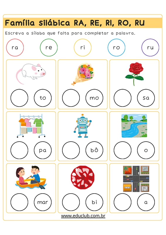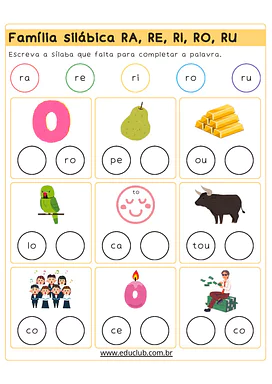 Nesta atividade, você encontrará exercícios práticos onde os alunos deverão completar palavras com as sílabas da família do R (RA, RE, RI, RO, RU). O material inclui diversas palavras ilustradas que facilitam a associação e o aprendizado, tornando o processo mais dinâmico e compreensível.