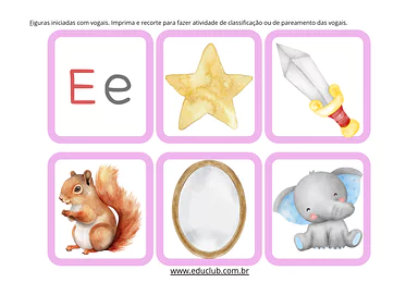- Vogal Ee: Elefante, Estrela, Escova, Espelho, Escada, Espada.