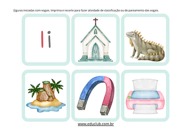 - Vogal Ii: Ilha, Índio, Igreja, Ioiô, Ímã, Iguana.