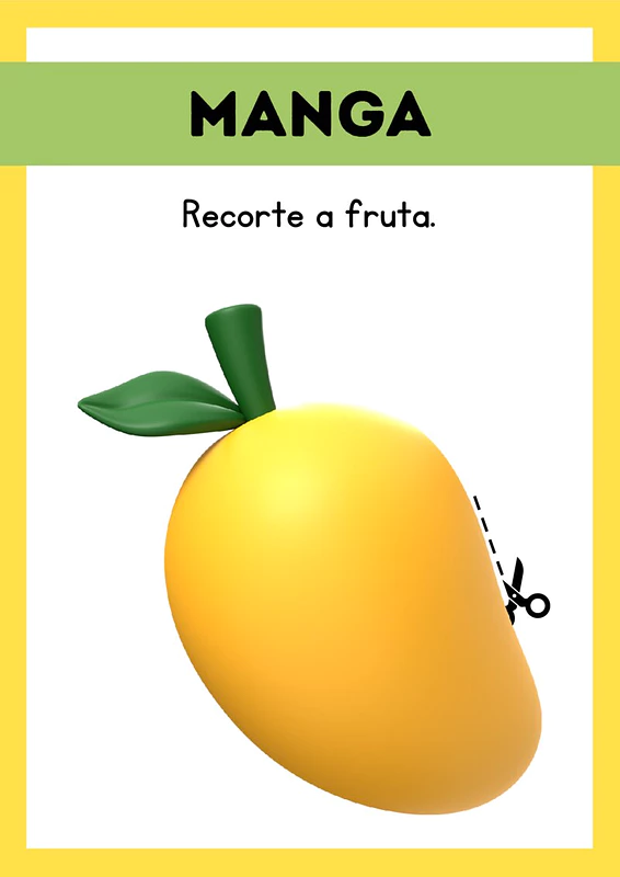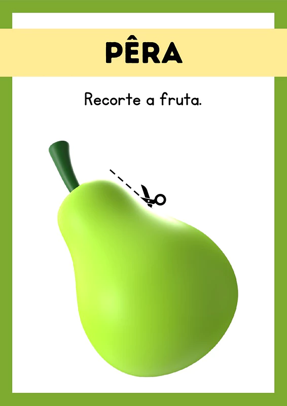 - Preparação e Pintura: Se o material for impresso em preto e branco, peça para os alunos colorirem as frutas com lápis de cor ou giz de cera antes de recortar. Isso ajuda a fixar as cores reais de cada alimento.