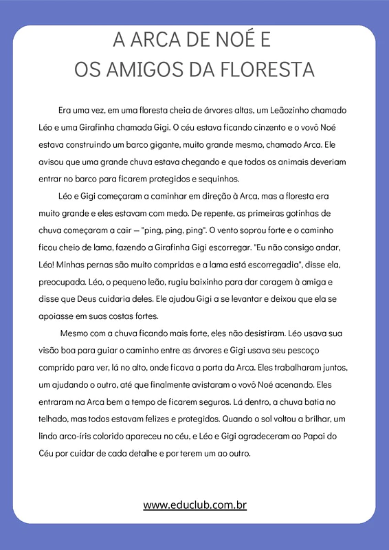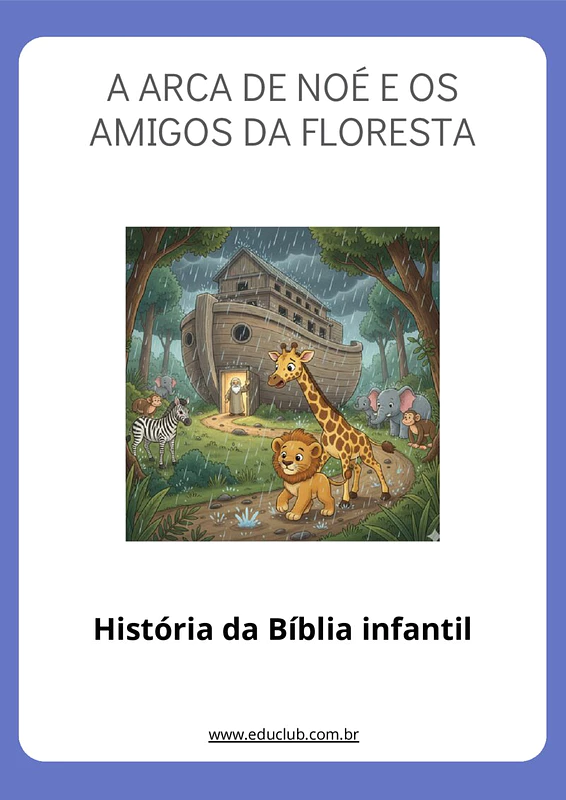 A Arca de Noé e os Amigos da Floresta é uma história encantadora que narra a aventura de Léo, um leãozinho, e Gigi, uma girafinha, que precisam chegar à Arca construída pelo vovô Noé antes de uma grande chuva. Enquanto atravessam a floresta, enfrentam desafios como a lama escorregadia, mas juntos superam os obstáculos. Léo ajuda Gigi a se levantar e usa sua visão aguçada para guiá-la, enquanto Gigi usa seu pescoço comprido para localizar a Arca. Com coragem e colaboração, eles chegam a tempo, se abrigam da chuva e, quando tudo se acalma, agradecem ao Papai do Céu pela proteção e pela amizade.