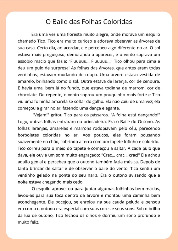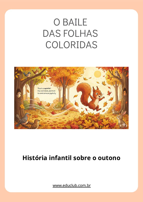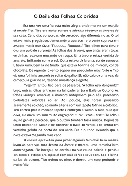 Neste material, você encontrará uma história infantil completa e envolvente sobre o outono, narrando as aventuras do esquilo Tico e sua descoberta das folhas coloridas e dos sons característicos da estação. O texto é rico em descrições sensoriais e elementos que capturam a atenção dos pequenos.