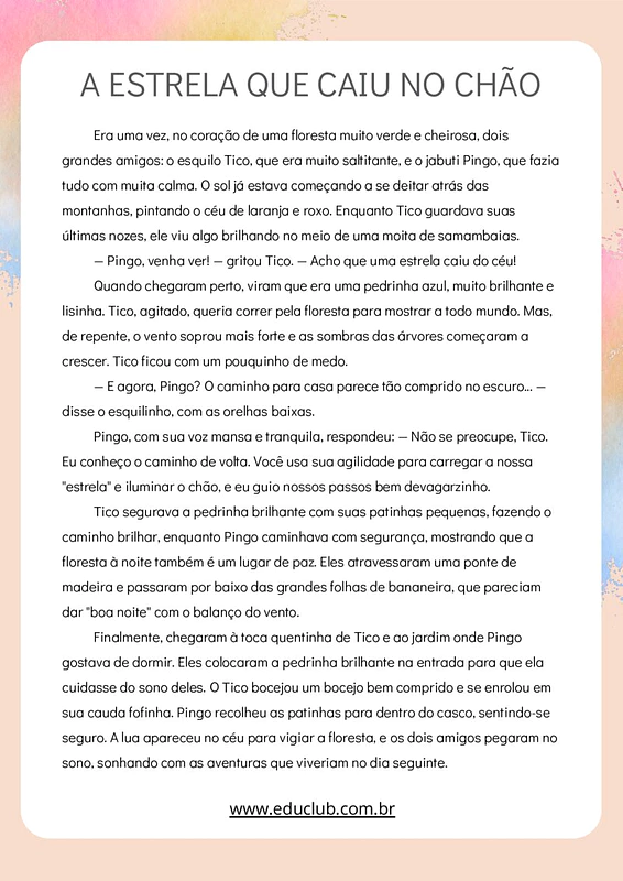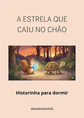 A Estrela que Caiu no Chão é uma encantadora história que se passa em uma floresta verde e cheirosa, onde vivem dois amigos: o esquilo Tico, que é muito agitado, e o jabuti Pingo, que é calmo e tranquilo. Um dia, ao guardar suas nozes, Tico encontra uma pedrinha azul brilhante que acredita ser uma estrela caída do céu. Animado, ele quer correr pela floresta para mostrar a todos, mas quando a noite chega, ele fica com medo do escuro. Pingo, com sua calma, oferece ajuda, sugerindo que Tico segure a pedrinha para iluminar o caminho enquanto ele guia os passos. Juntos, eles atravessam a floresta e chegam em segurança ao lar de Tico, onde colocam a pedrinha na entrada para cuidar do sono deles. Com a lua brilhando no céu, os dois amigos adormecem, sonhando com novas aventuras.