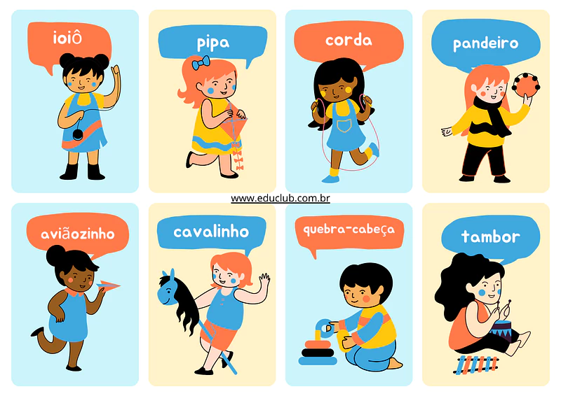 Mímica das brincadeiras: Coloque as cartas viradas para baixo. A criança sorteia uma e, sem falar, deve usar o corpo para fazer a mímica daquela brincadeira (pular corda, jogar basquete, tocar flauta). Os outros devem adivinhar qual é o brinquedo. É um excelente exercício de expressão corporal, criatividade e observação.