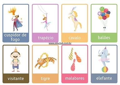 Neste material, você encontrará um Jogo da memória de circo para imprimir com diversas cartas ilustradas, contendo elementos típicos do circo, como pipoca, leão, mágico, acróbatas, lona, monociclo, cuspidor de fogo, trapézio, cavalo, balões, visitante, tigre, malabares e elefante. As cartas são coloridas e atrativas, prontas para serem impressas e recortadas.