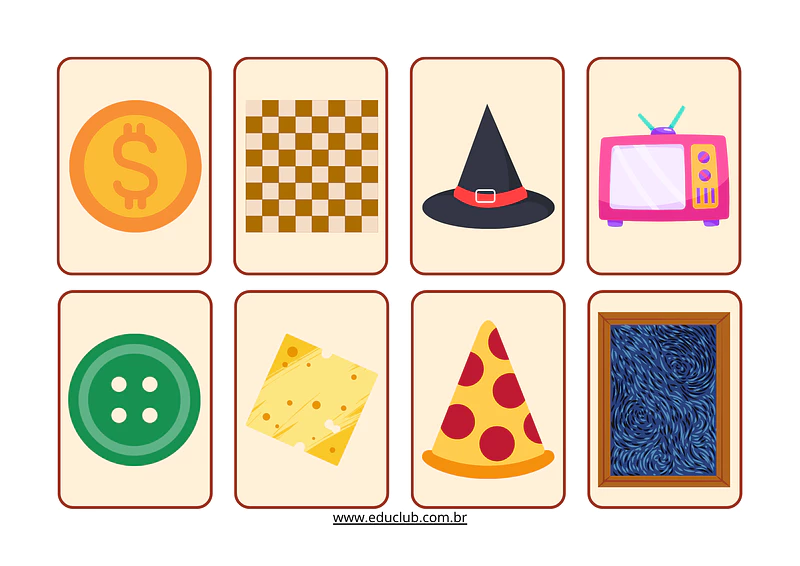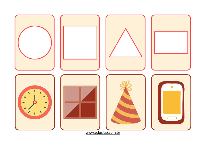 • Cartões com objetos do cotidiano: Uma variedade de cartões ilustrados com objetos que as crianças conhecem (uma fatia de pizza, um botão, uma janela, uma bola). Cada objeto tem o formato de uma das formas geométricas dos tabuleiros.