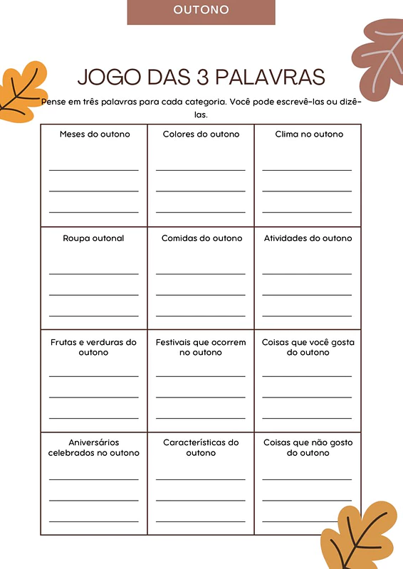 O Jogo das Três Palavras é uma atividade educativa temática voltada para a estação do Outono. Ele utiliza uma estrutura de categorias para estimular o vocabulário e o repertório cultural dos participantes sobre as transformações que ocorrem nesta época do ano.