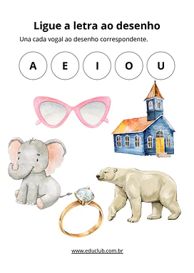 Neste material, você encontrará folhas de atividades com o título Ligue a letra ao desenho, onde cada vogal (A, E, I, O, U) é apresentada ao lado de desenhos cujos nomes iniciam com a respectiva vogal. As crianças deverão traçar uma linha ligando a letra ao desenho correto, reforçando o aprendizado das vogais.
