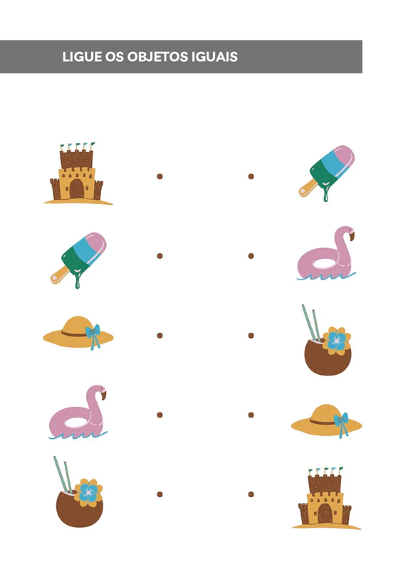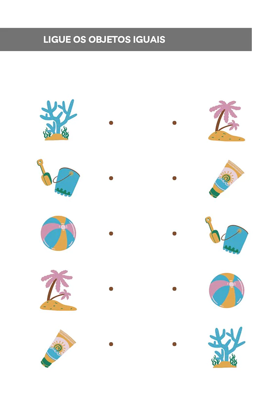 O material ligue os objetos iguais é uma atividade envolvente e visualmente estimulante, projetada para desenvolver habilidades essenciais de percepção visual e atenção em crianças pequenas. Esta proposta lúdica convida os alunos a identificar e conectar elementos idênticos, promovendo o reconhecimento de padrões e a discriminação visual de forma divertida.