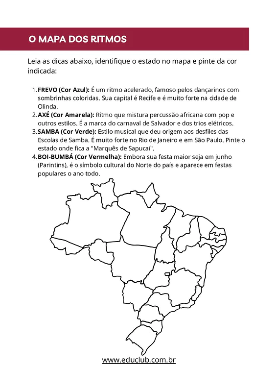 Neste recurso, você encontrará um mapa do Brasil com espaços para identificação de estados e instruções detalhadas sobre quatro ritmos carnavalescos distintos: Frevo, Axé, Samba e Boi-Bumbá. Cada ritmo é acompanhado de dicas e uma cor específica para colorir o estado correspondente.