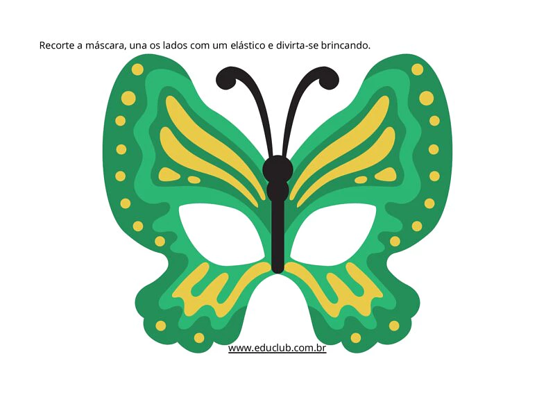 Neste material, você encontrará um modelo de máscara de borboleta pronto para ser impresso e colorido. As instruções são claras e simples: pintar, recortar e unir as laterais com um elástico para que a criança possa usar e brincar.