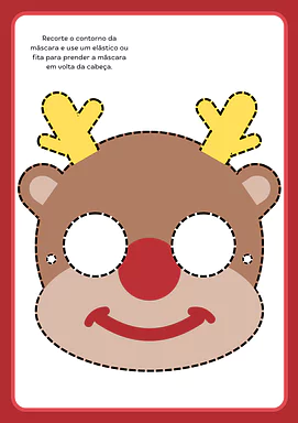 O material contém máscaras temáticas de Natal prontas para imprimir, com contornos definidos para facilitar o recorte. Inclui instruções simples de montagem utilizando elástico ou fita para fixação. As máscaras apresentam designs festivos que encantam e motivam as crianças a participarem das atividades natalinas.
