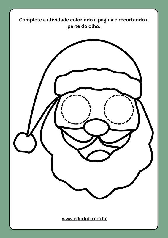 Contém o molde de uma máscara de Papai Noel em preto e branco. A atividade instrui a criança a colorir o desenho e recortar a área dos olhos para poder usá-la.