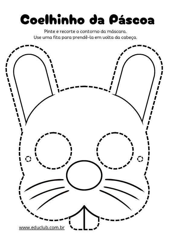 Nesta atividade, você encontrará um molde de máscara de coelhinho da Páscoa pronto para ser impresso. O material instrui as crianças a pintar e recortar o contorno da máscara, sugerindo o uso de uma fita para prendê-la na cabeça, transformando-a em um acessório divertido.