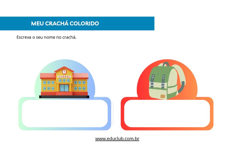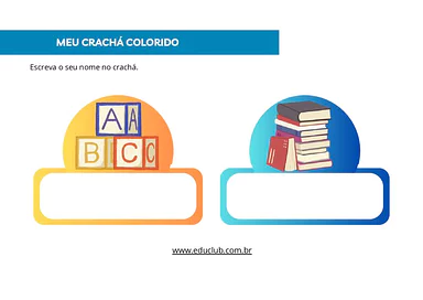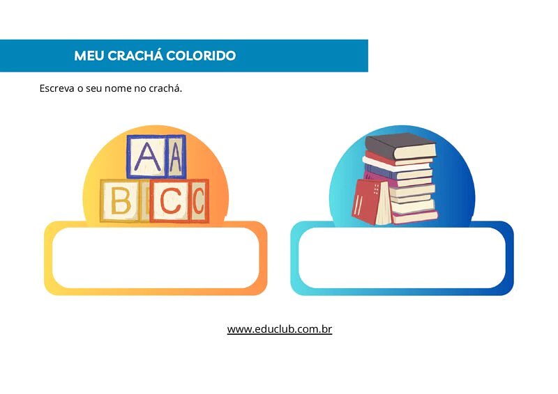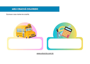 Neste material, você encontrará modelos de crachás coloridos e prontos para impressão, com espaço dedicado para a criança escrever seu nome. O design é atrativo e convidativo, incentivando a participação ativa dos pequenos na personalização de seu próprio crachá.